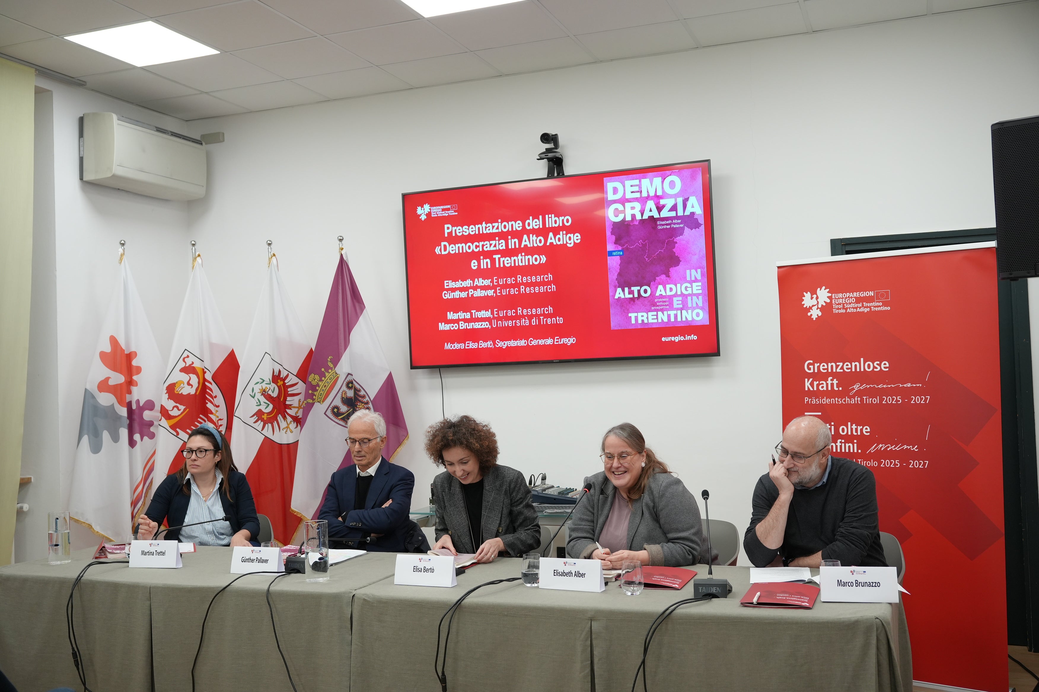 - Presentato durante l’ultimo appuntamento dei Martedì dell’Euregio 2025 il libro “Democrazia in Alto Adige e in Trentino”: nella foto da sinistra Martina Trettel (Eurac Research), Günther Pallaver (Eurac Research, autore del libro), Elisa Bertò (moderatrice, Segretariato Generale dell'Euregio), Elisabeth Alber (Eurac Research, autrice del libro) e Marco Brunazzo (UniTN). (Foto: Euregio/Nicole Zambanini) » [IMG 2 MB]