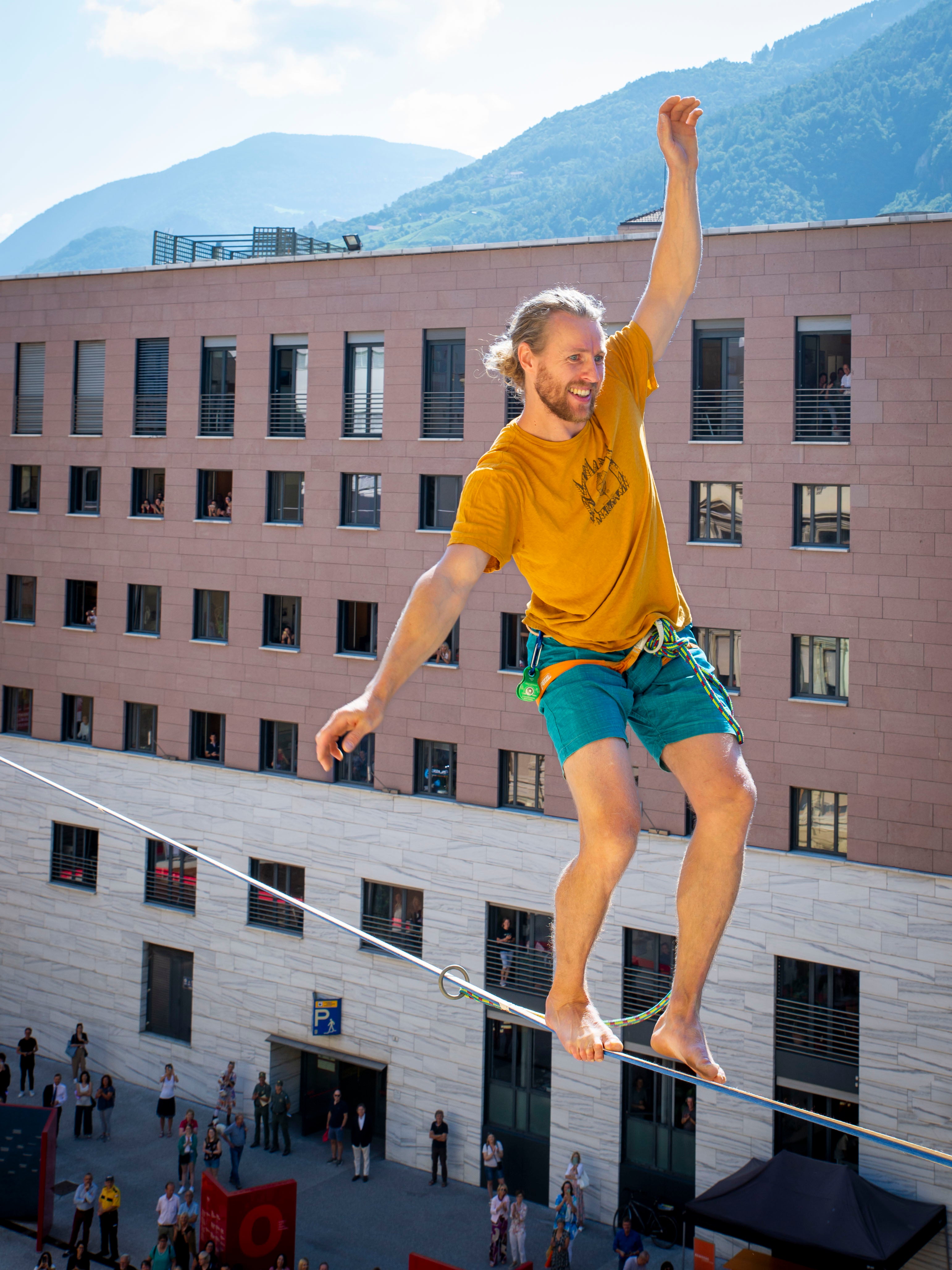 Mich Kemeter, il sette volte detentore del record mondiale di slackline della Stiria (A), ha attraversato piazza Silvius Magnago su una highline di 80 metri tesa tra il Consiglio provinciale e Palazzo Widmann (Foto: ASP/Fabio Brucculeri)