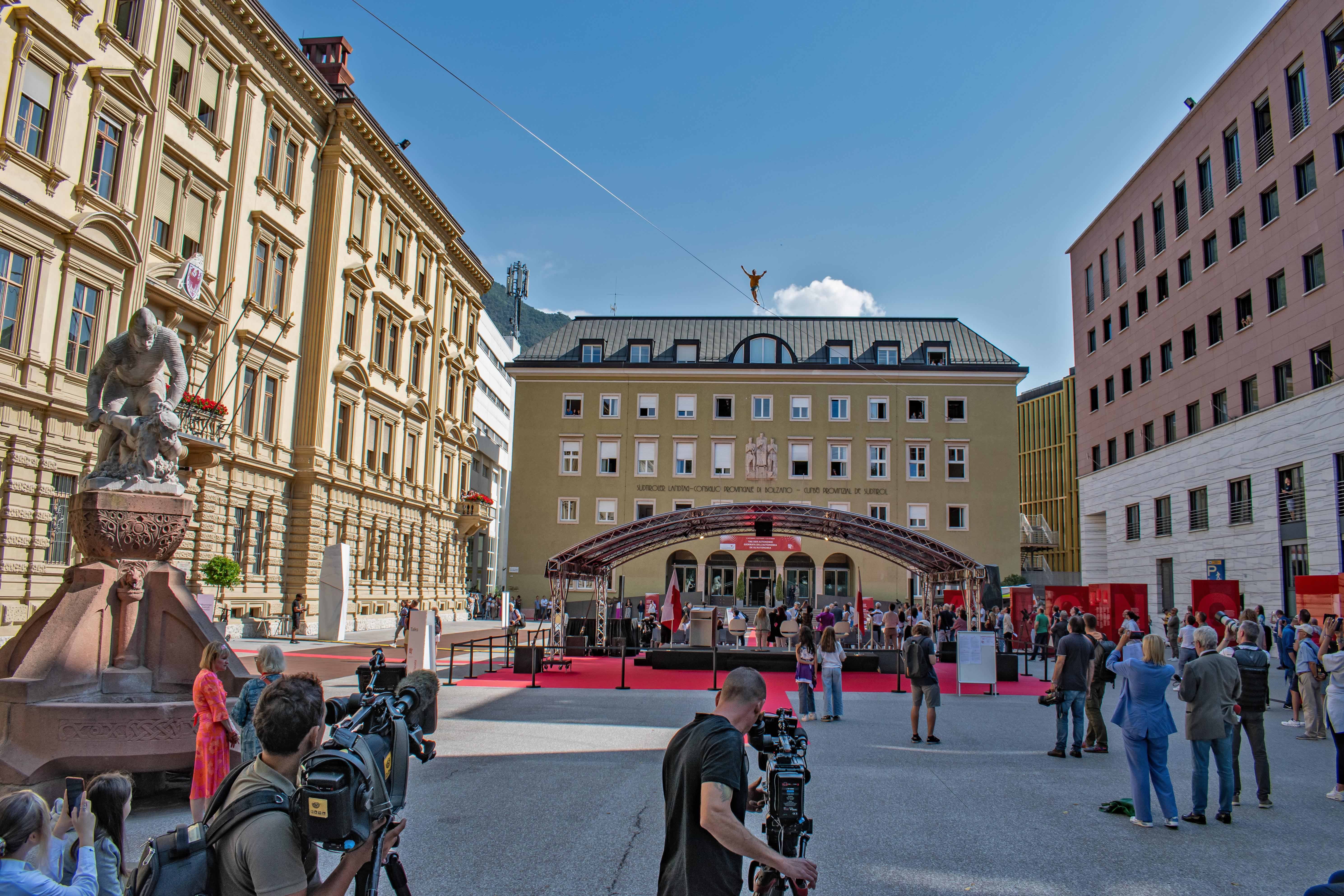 Uno dei momenti salienti della mattinata: Mich Kemeter, il sette volte detentore del record mondiale di slackline della Stiria (A), ha attraversato piazza Silvius Magnago su una highline di 80 metri tesa tra il Consiglio provinciale e Palazzo Widmann. Un gesto funambolico che simboleggia l’azione della politica: cercare l’equilibrio, creare ponti, superare confini. È prevista una seconda traversata alle ore 18.00.