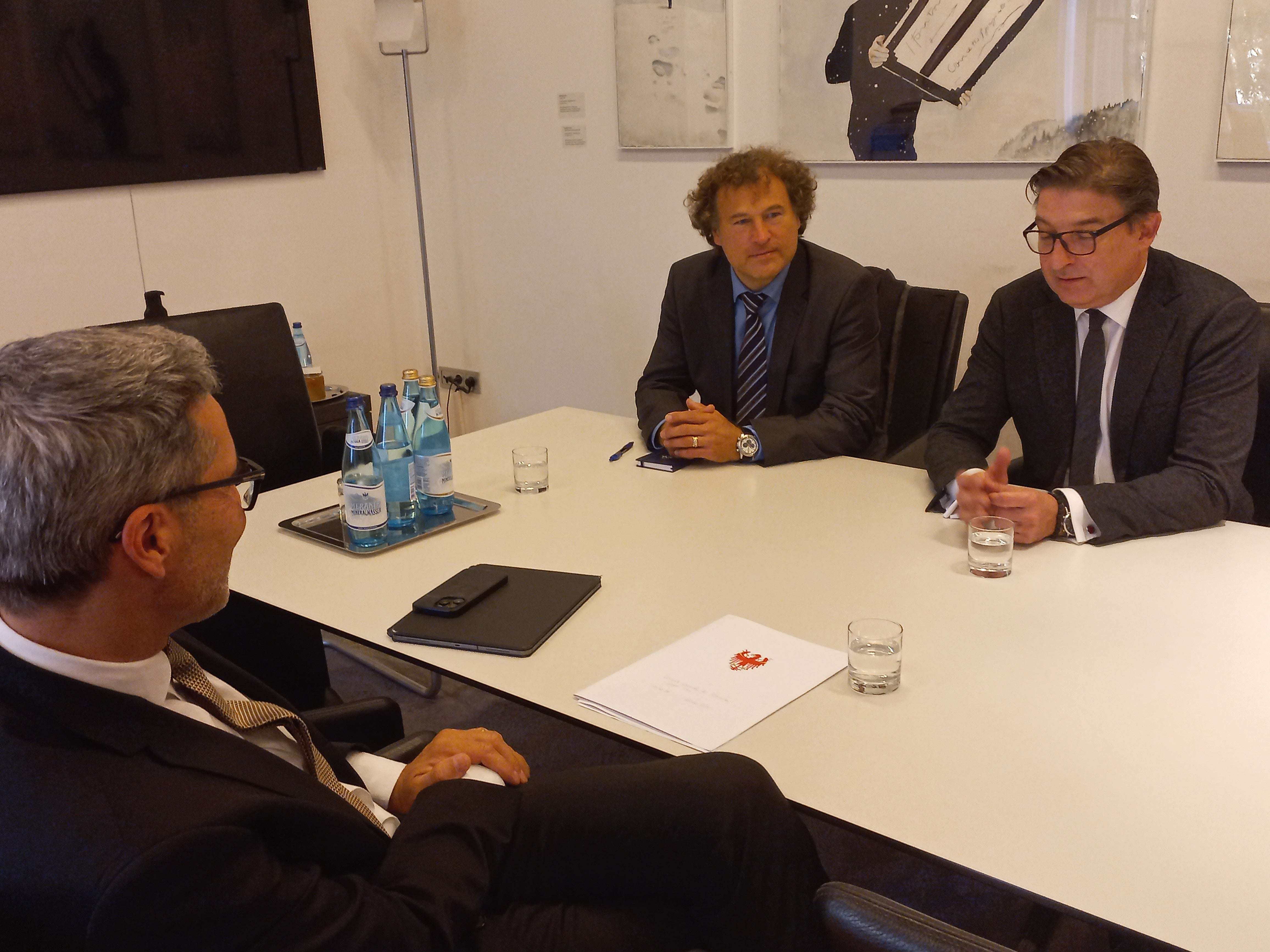 - Lo scambio tra il presidente Kompatscher (di spalle) e il console generale Gregor Šuc (a destra), al quale ha preso parte anche il console Golob (a sinistra), è stato incentrato su tutela delle minoranze e riconoscimento dei titoli di studio. (Foto: USP/mdg) » [IMG 2 MB]